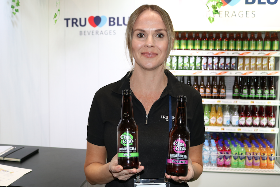 - Amy Hurrey from Tru Blu Beverages showed off three flavours in the newly launched Cha Cha Kombucha range including the Original (green label) and Raspberry (right).