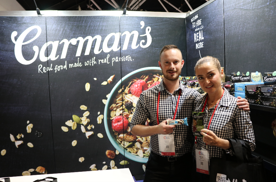 - Hayden Connolly and Hannah Elman from Carman’s Kitchen with two new products launched at the show – the limited edition Cookies & Cream Protein bar and the Super Seed & Grain Crackers